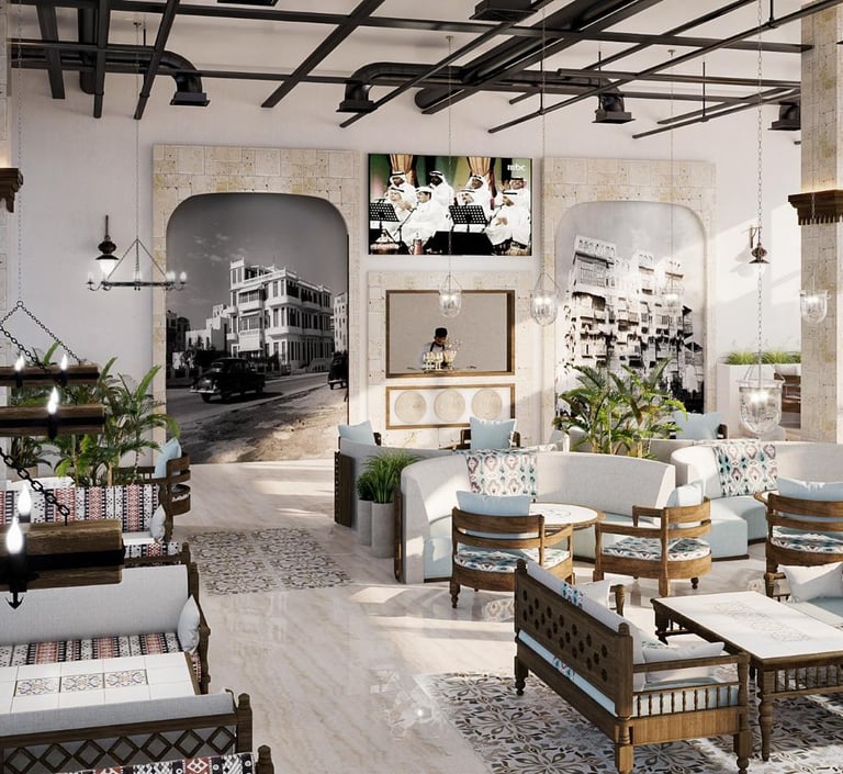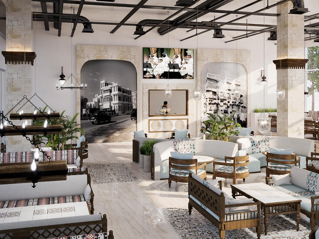 Experience the finest Middle Eastern cuisine with stunning sea views at Jeddah Yacht Club, featuring hijazi style decor and comfortable seating.